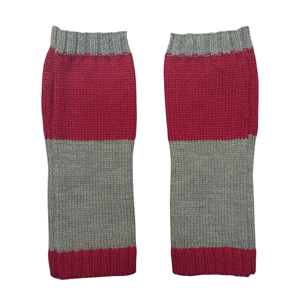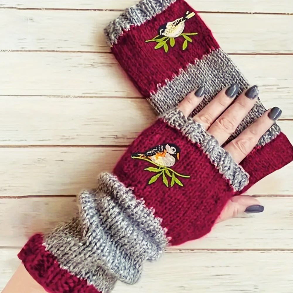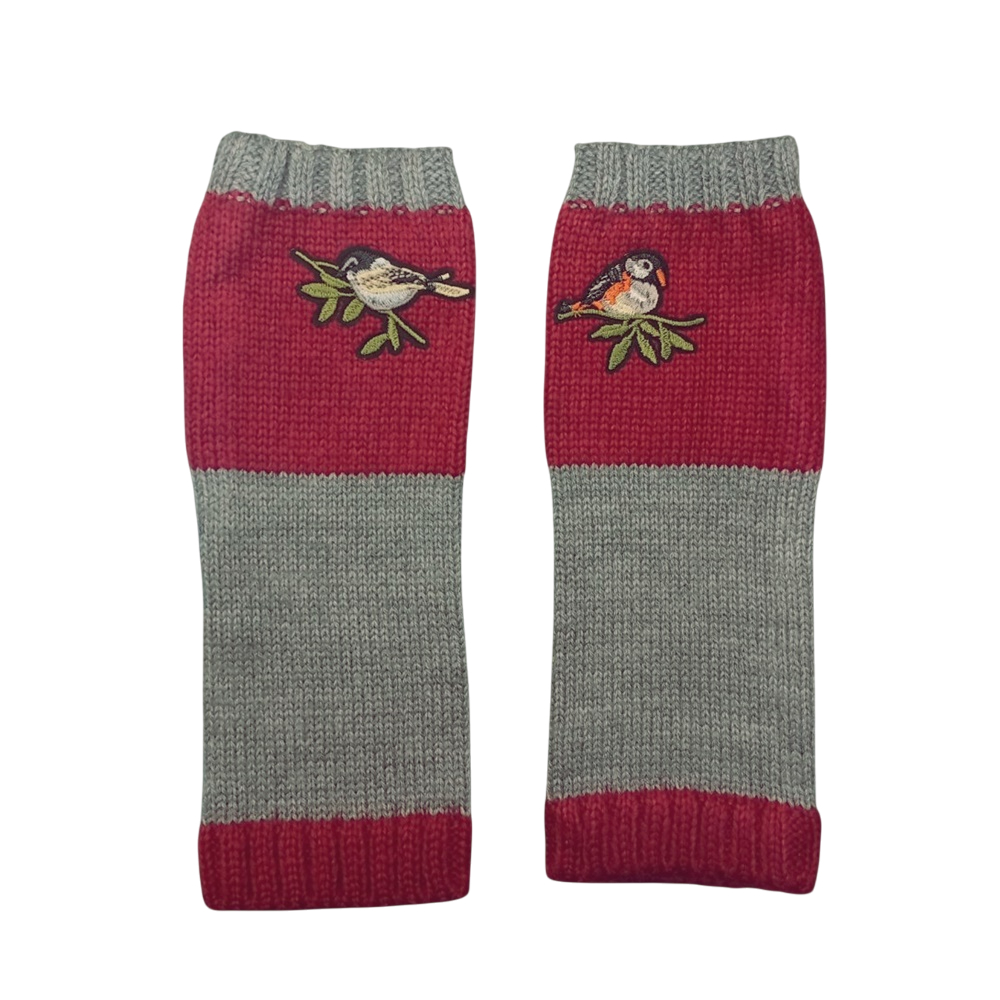 Γάντια Πλεκτά με Κομμένα Δάχτυλα και Κεντητό Πουλί (Γκρι/Μπορντώ)