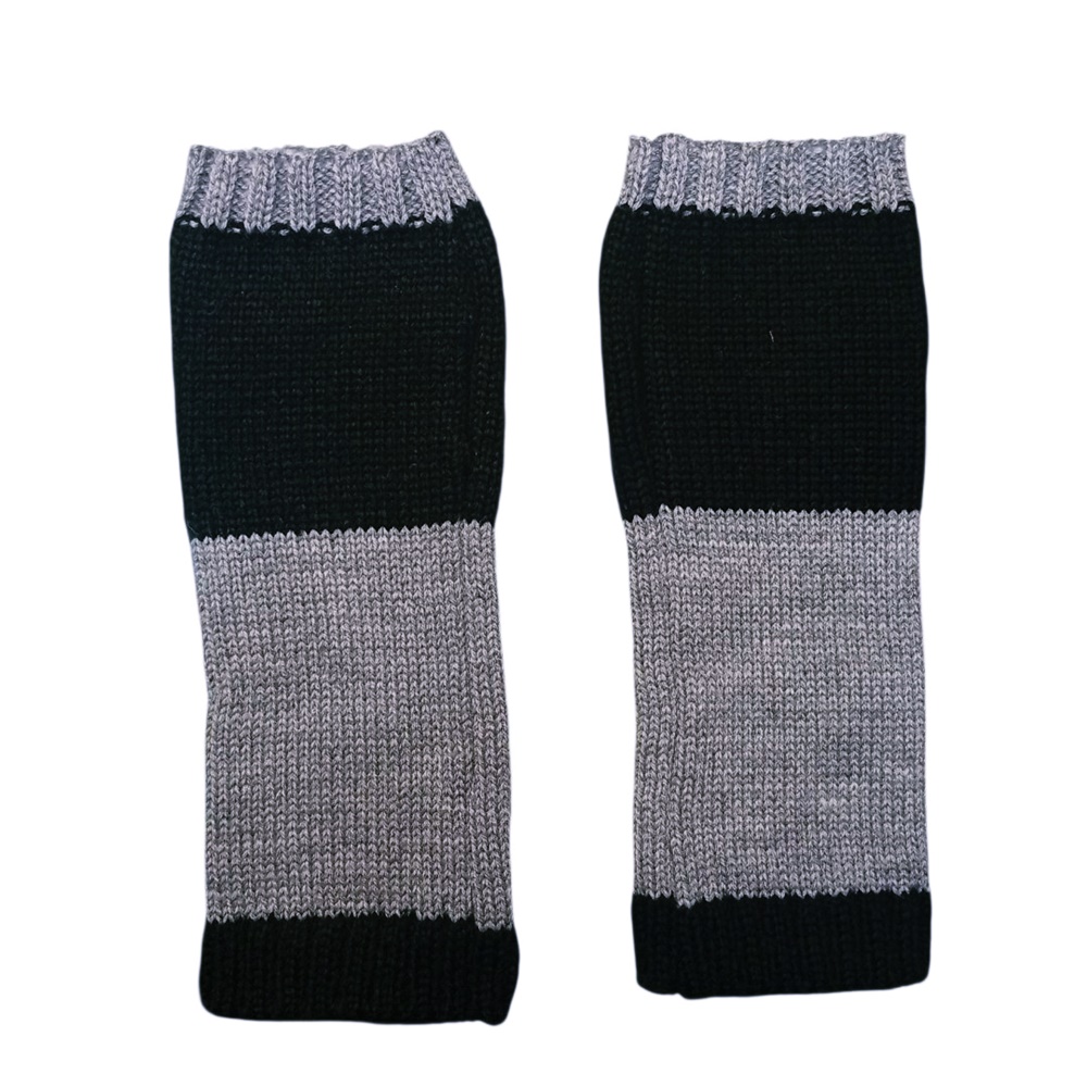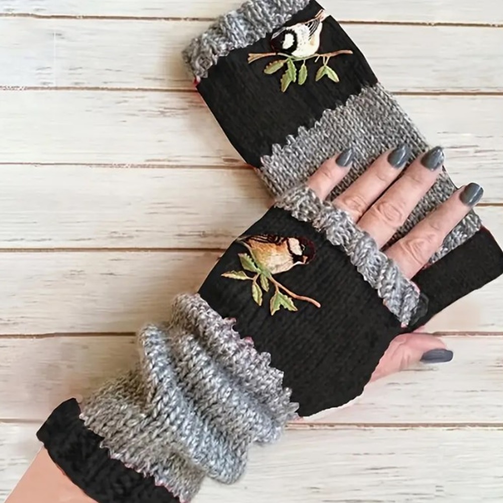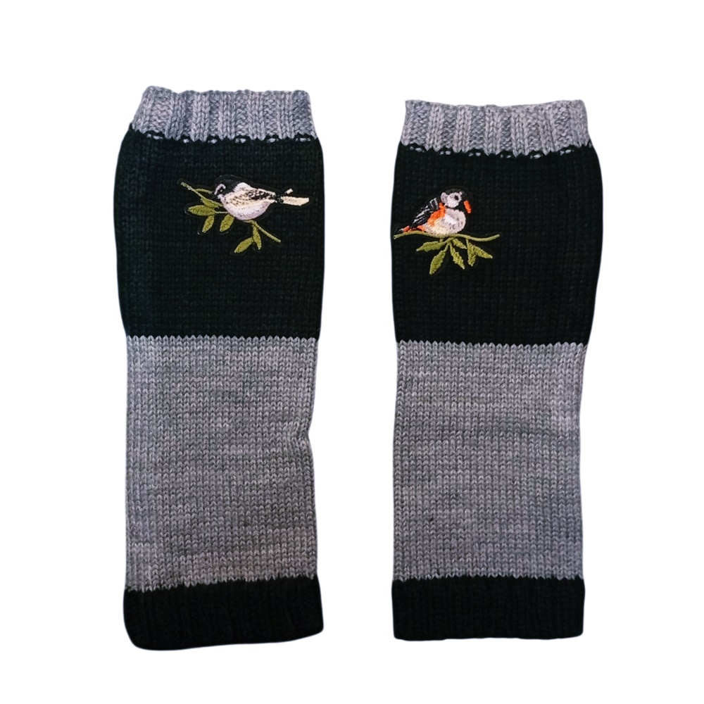 Γάντια Πλεκτά με Κομμένα Δάχτυλα και Κεντητό Πουλί (Γκρι/Μαύρο)