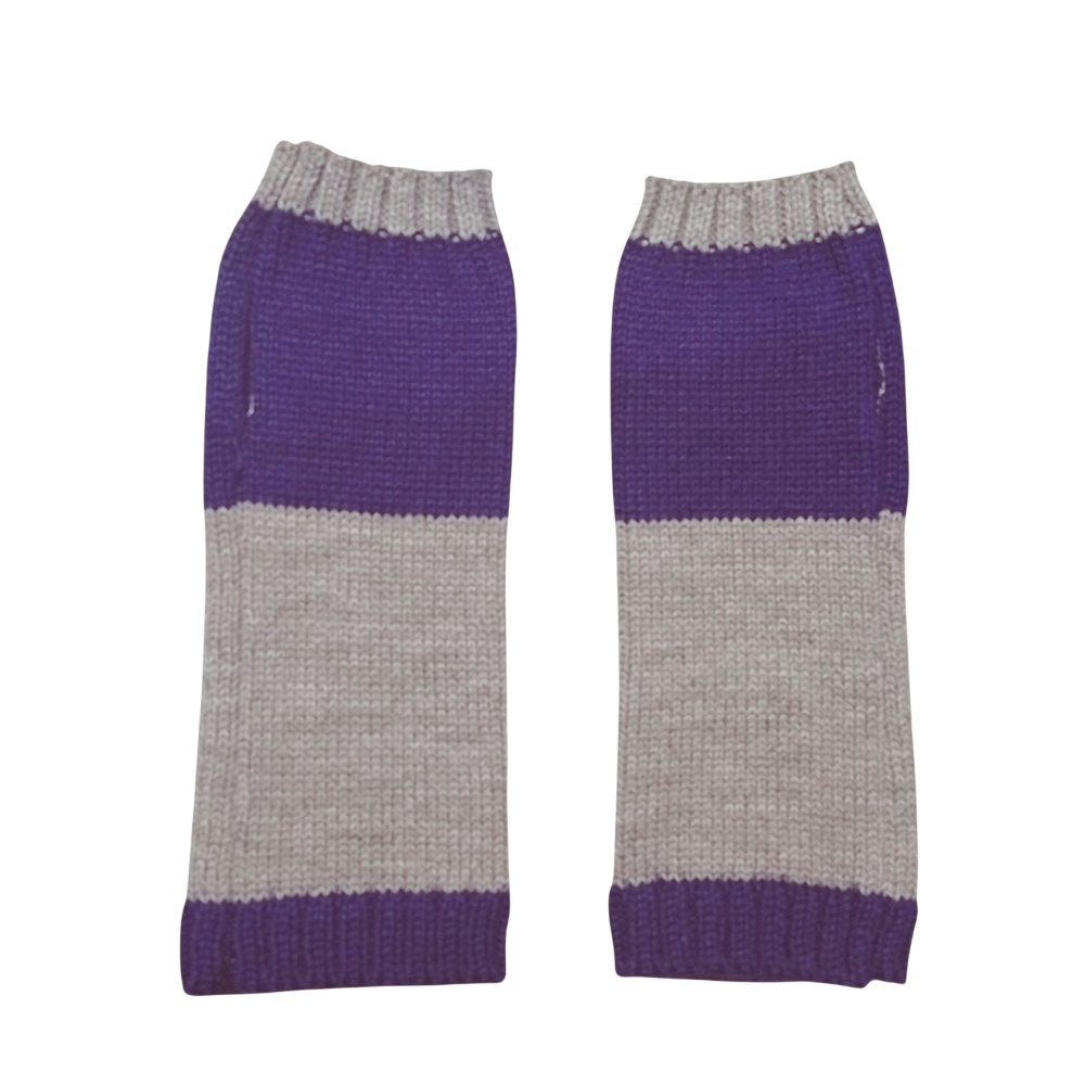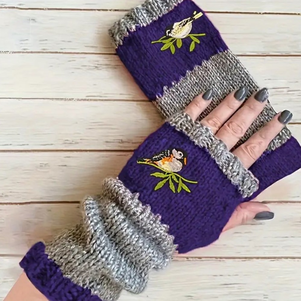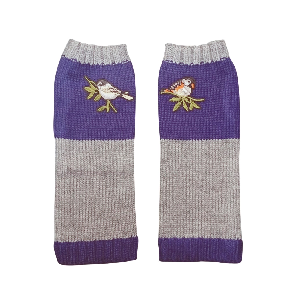 Γάντια Πλεκτά με Κομμένα Δάχτυλα και Κεντητό Πουλί (Γκρι/Μωβ)